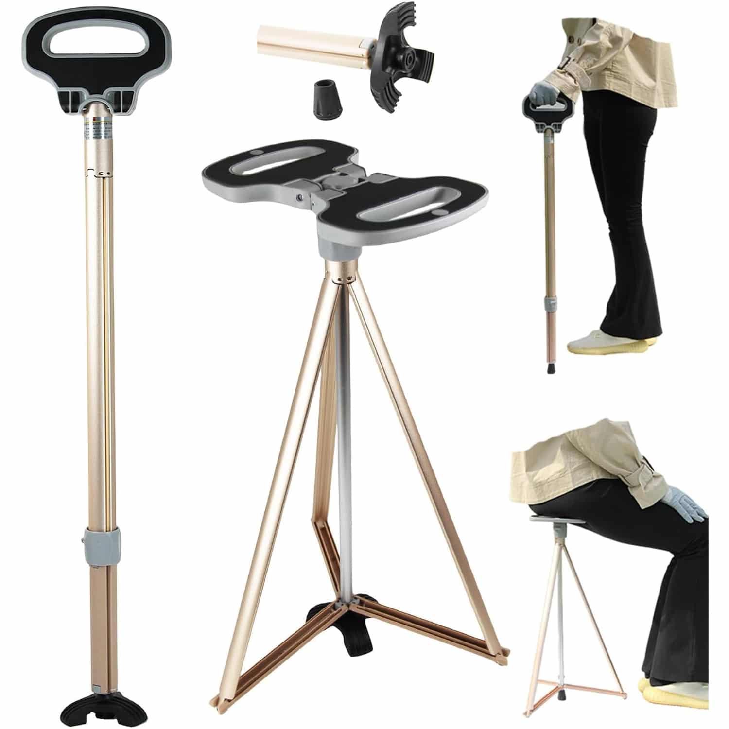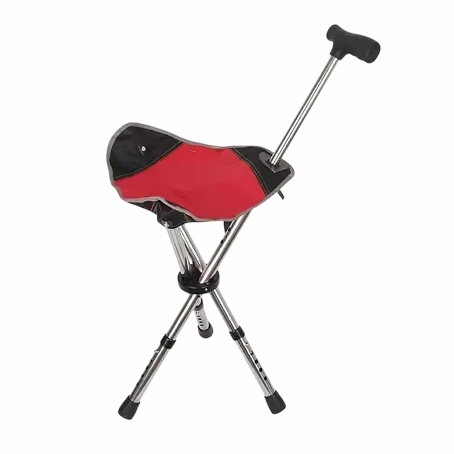 Het driehoekige basisdesign biedt uitstekende stabiliteit tijdens zowel het lopen als het zitten, met een anti-slip mat die veiligheid garandeert op diverse ondergronden. De opvouwbare constructie maakt opslag en transport moeiteloos.
